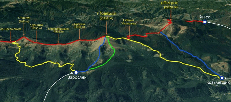 📍 Кваси → підйом на Петрос → Перемичка → Говерла → Брескул, Пожижевська, Данциж, Туркул → оз. Несамовите → траверс г. Ребра, Бребенескул, Менчул → г. Дземброня → ПІЧ → Вухатий Камінь → пол. Смотрич → с. Дземброня. 🔄 ~ 53 км