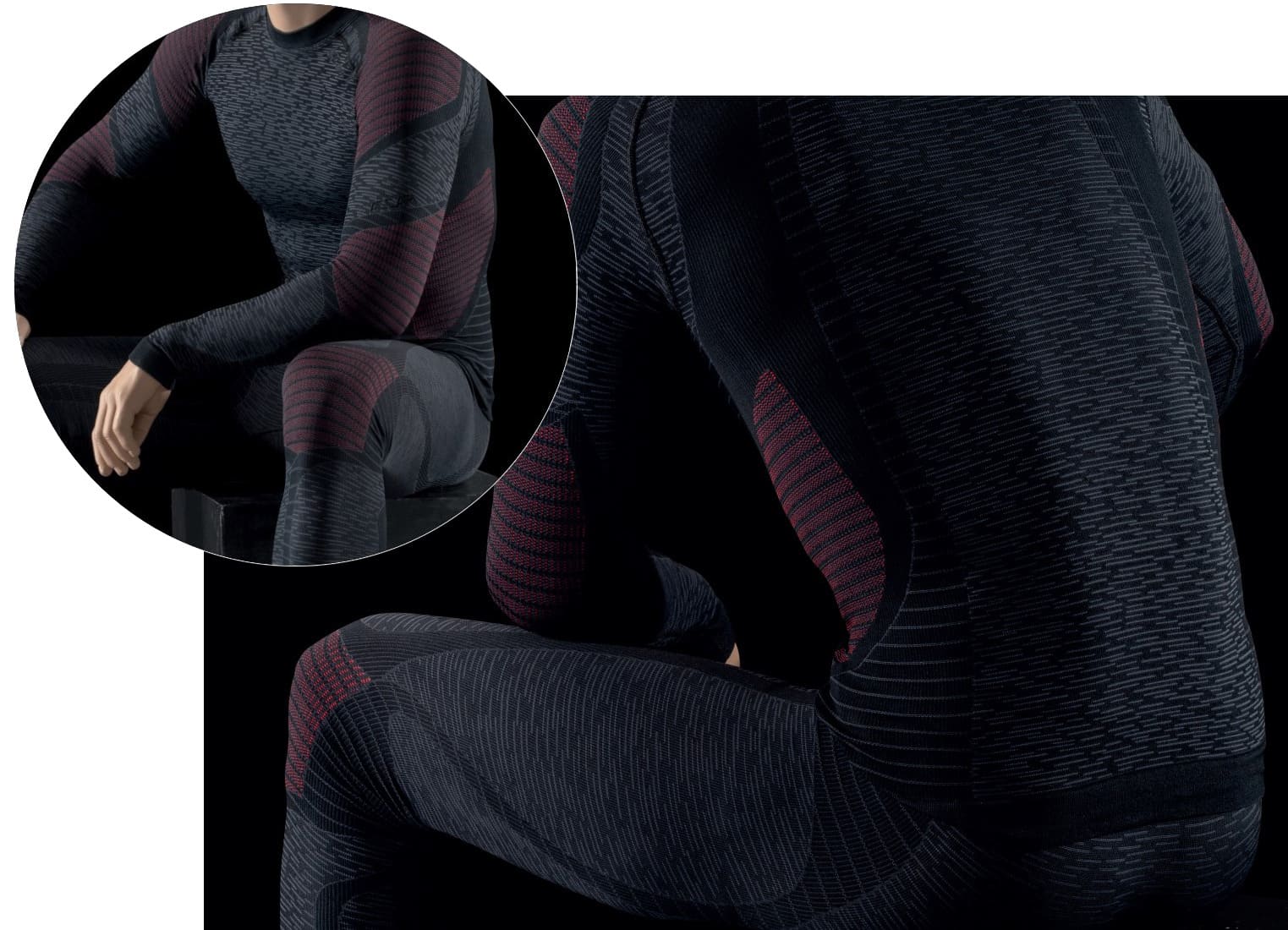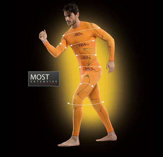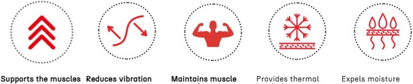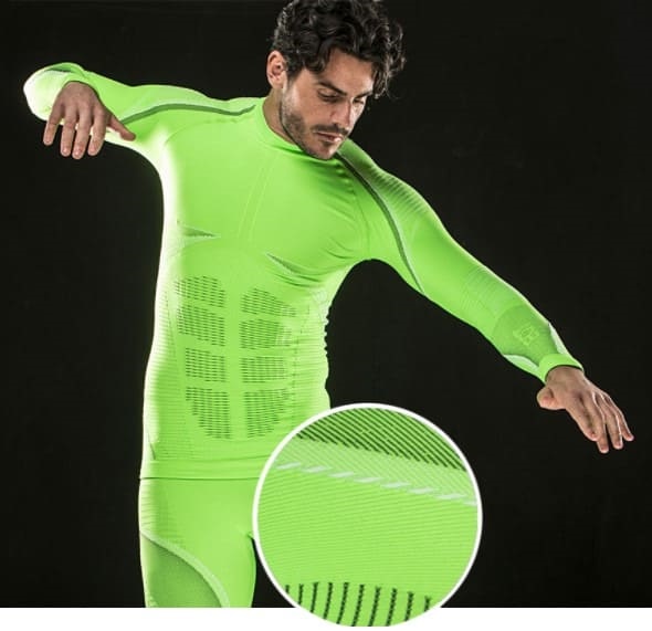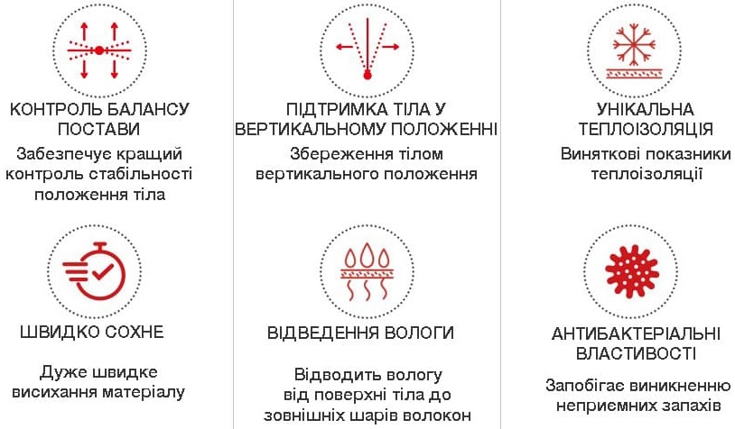 Білизна тонка, еластична, з плоскими швами. Регулює температуру тіла як в холод, так і в спеку, контролює вологість. Волокна FIR активізують кровообіг і відновлення тканин, знижують ймовірність судом і перевтоми.
