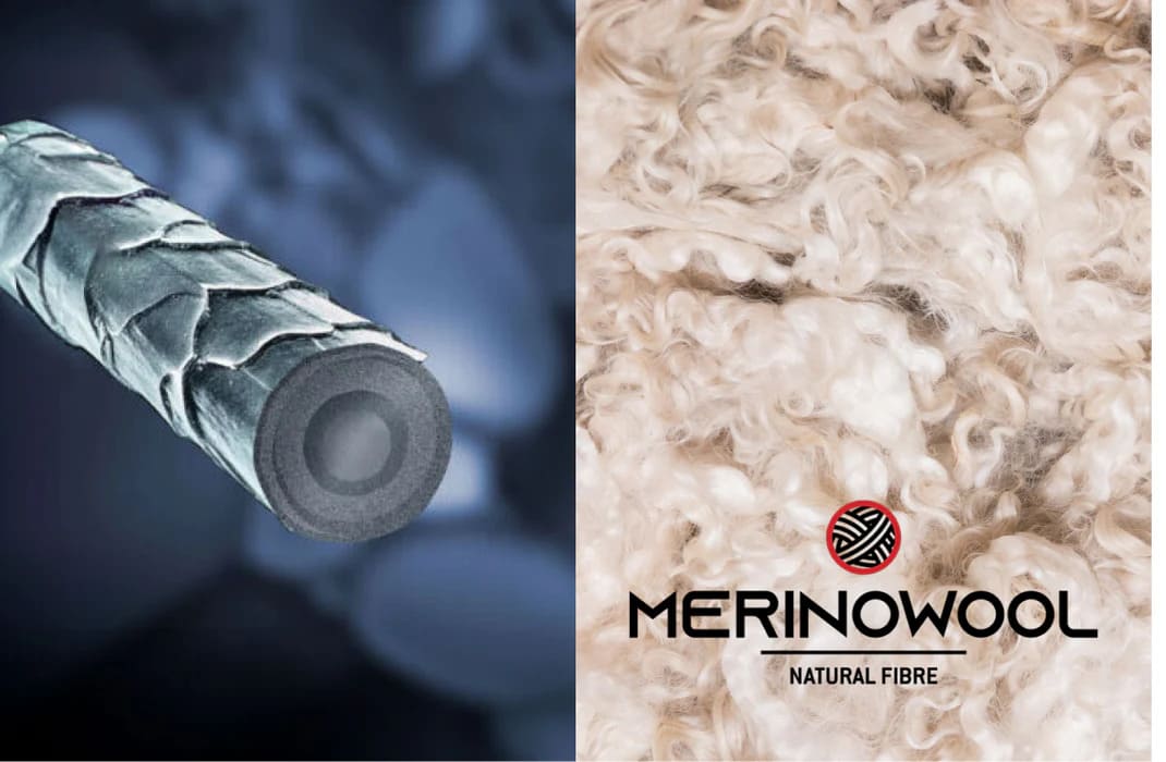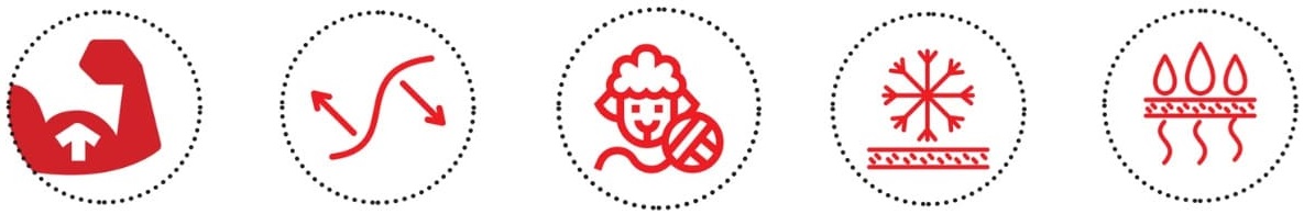 Мериносова вовна м'яка, тонка, гіпоалергенна. Швидко сохне, стійка до утворення неприємних запахів. Закручені волокна утримують повітря і працюють як теплоізолятор: захищають від переохолодження і перегріву, підтримують стабільну температуру. Зональна вентиляція швидко виводить вологу й надлишки тепла в “гарячих точках” (наприклад, під пахвами).