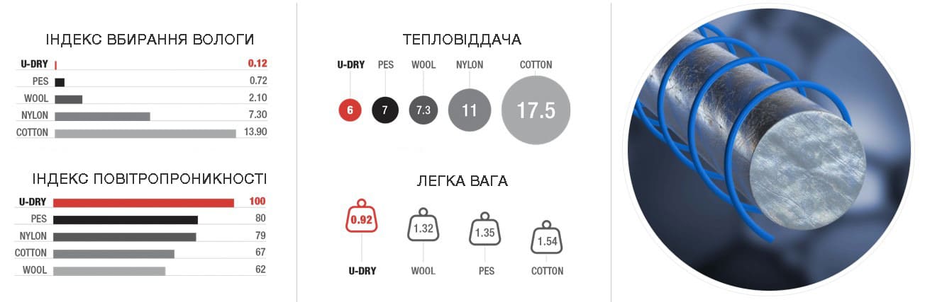 Волокна U-DRY майже не поглинають вологу, забезпечують теплоізоляцію, комфорт і сухість під час інтенсивних занять.