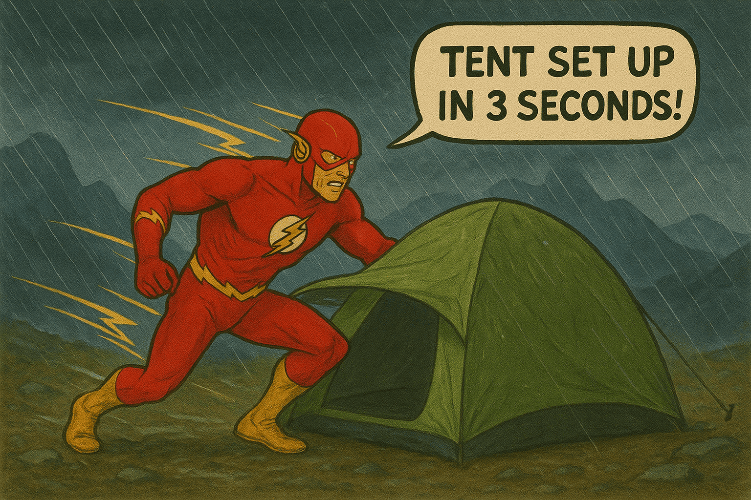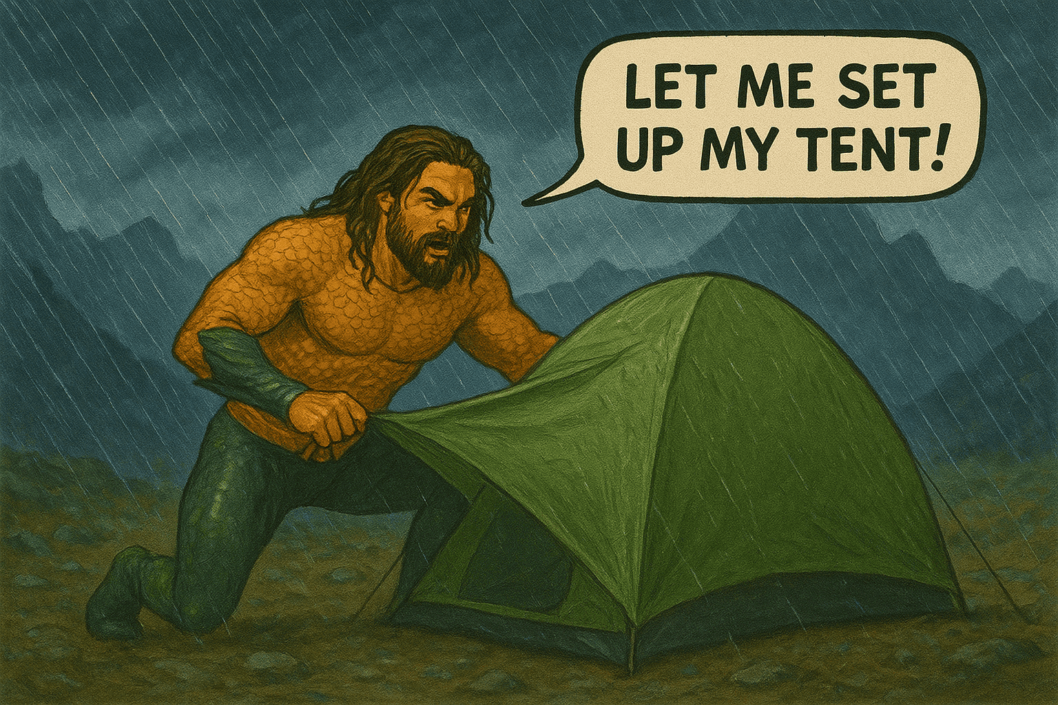 Щоб поставити намет під зливою й нічого не намокло, не треба бути Акваменом. Правильне спорядження, навички, вивірена стратегія, — і все вийде супер навіть без суперздібностей:)